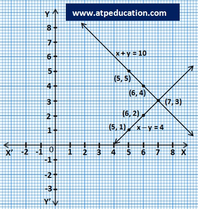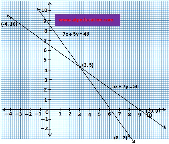 ग्राफीय विधि से हल के लिए हम जब बने ग्राफ को देखते हैं तो पाते हैं कि बिंदु (7, 3) दिए गए समीकरण के लिए प्रतिच्छेदन बिंदु है जो कि रैखिक समीकरण युग्म का उभयनिष्ठ हल है |