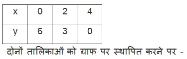 अब इसमें x का मान 0, 2 और 4 रखने पर y का मान क्रमश: 6, 3 और 0 प्राप्त होता है जिसकी तालिका निम्न है |