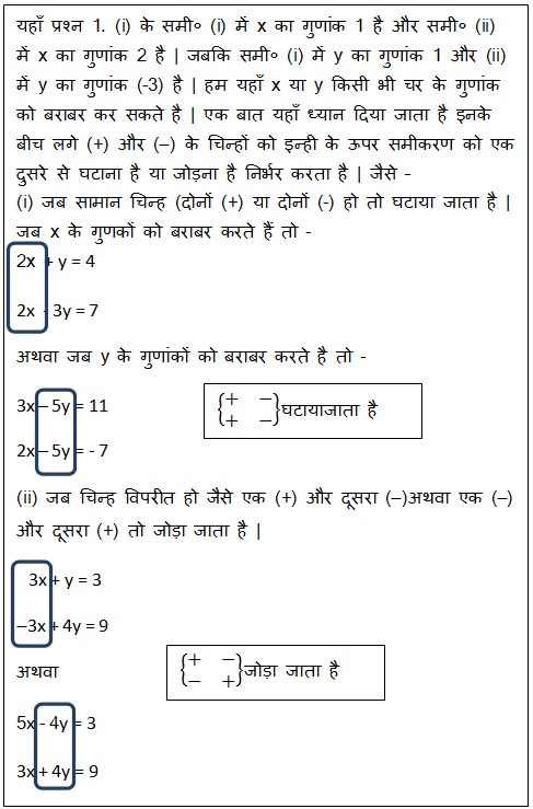 विलोपन विधि (Substitution Method) : इस विधि में समीकरण (i) और समीकरण (ii) के चर x या y किसी एक चर के गुणांकों (coefficients)को बराबर किया जाता है और फिर इन समीकरणों को एक दुसरे में से घटाया या जमा किया जाता है | घटाने पर जिस चर को हमने बराबर किया था वह विलोपित हो जाता है | और तब अन्य चर का मान प्राप्त करते है, और उस चर के मान को किसी भी समीकरण में रखने पर विलोपित चर का मान प्राप्त हो जाता है | (ATP Education Help)