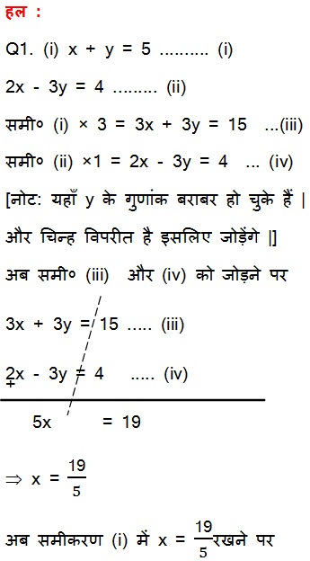 Q1. निम्न समीकरणों के युग्म को विलोपन विधि तथा प्रतिस्थापना विधि से हल कीजिए | कौन सी विधि अधिक उपयुक्त है ?