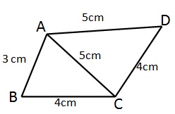 Q2. एक चतुर्भुज ABCD का क्षेत्रफल ज्ञात कीजिए, जिसमें AB = 3 cm, BC = 4 cm, CD = 4 cm, DA = 5 cm और AC = 5 cm है।