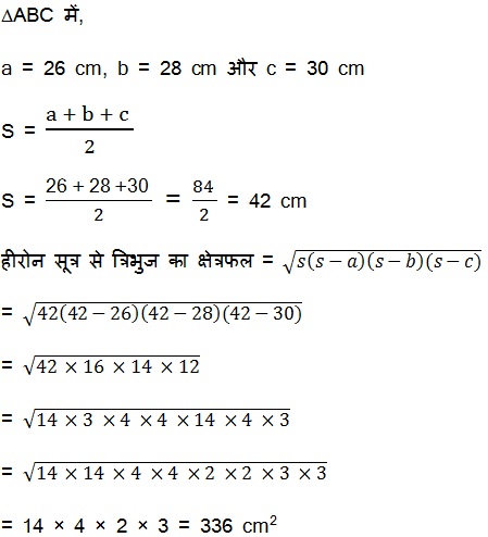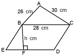 Q4. एक त्रिभुज और एक समांतर चतुर्भुज का एक ही आधर है और क्षेत्रफल भी एक ही है। यदि त्रिभुज की भुजाएँ 26 cm, 28 cm और 30 cm हैं तथा समांतर चतुर्भुज 28 cm के आधर पर स्थित है, तो उसकी संगत ऊँचाई ज्ञात कीजिए।