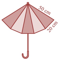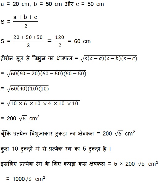 Q6. दो विभिन्न रंगों के कपड़ों के 10 त्रिभुजाकार टुकड़ों को सीकर एक छाता बनाया गया है (देखिए आकृति 12.16)। प्रत्येक टुकड़े के माप 20 cm, 50 cm और 50 cm हैं। छाते में प्रत्येक रंग का कितना कपड़ा लगा है?