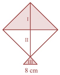 Q7. एक पतंग तीन भिन्न-भिन्न शेडों (shades) के कागजों से बनी है। इन्हें आकृति 12.17 में I, II और III से दर्शाया गया है। पतंग का ऊपरी भाग 32 cm विकर्ण का एक वर्ग है और निचला भाग 6 cm, 6 cm और 8 cm भुजाओं का एक समद्विबाहु त्रिभुज है। ज्ञात कीजिए कि प्रत्येक शेड का कितना कागज प्रयुक्त किया गया है।